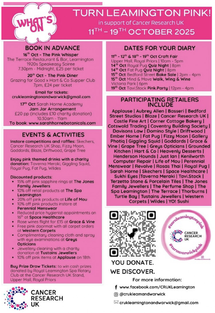 - Public: wear pink, visit participating stores, donate via QR codes or collection boxes, and join the Paint Leamington Pink Trial via the Love Leam App