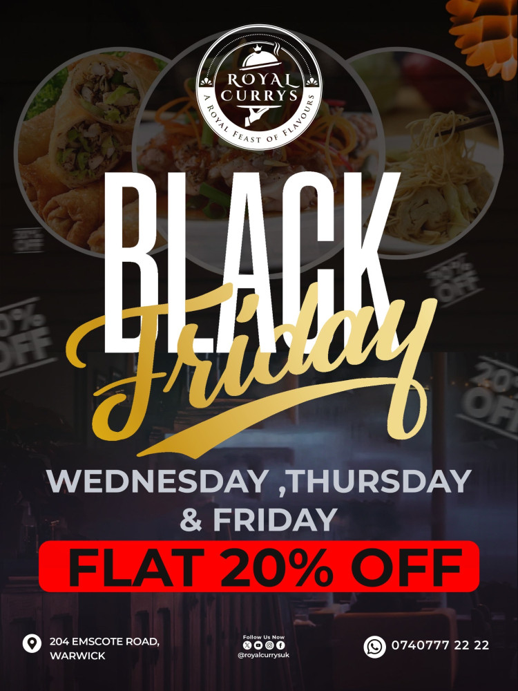 Royal Currys is offering a Black Friday Deal on Wednesday, Thursday, and Friday for a flat 20 percent off your bill. It's a good excuse to drop by with family or friends and enjoy your favourite dishes.