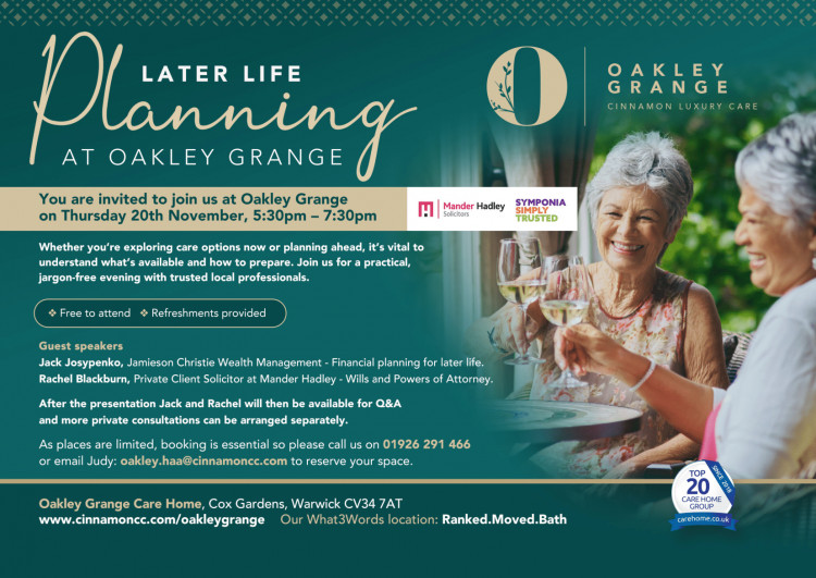 Oakley Grange Care Home is throwing its doors open to the community on Thursday 20 November for an informative evening on 'Later Life Planning'.