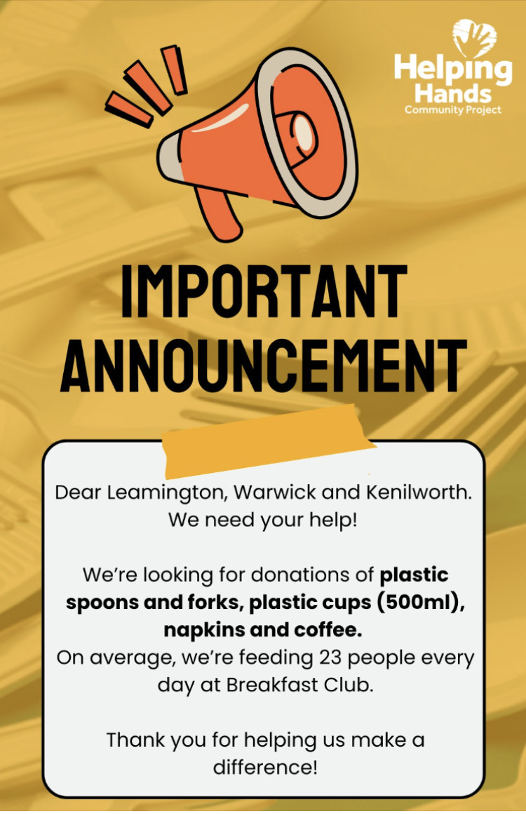 Helping Hands charity, based in Leamington Spa is looking for donations of plastic spoons and forks, plastic cups (500ml), napkins and coffee.